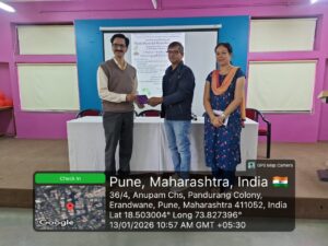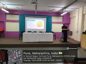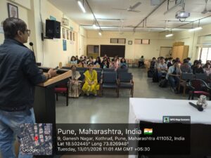 An Awareness Session on Plastic Waste and E-Waste Management and Its Environmental Impact was organized for the students in association with ServCare, Pune on 13 January 2026 at 10.30 a.m. The session was conducted by Mr. Avinash Jadhav, who is currently associated with Muskmelon Envtech Pvt. Ltd., where he has been handling operations and digital product initiatives for the past four years. With an overall experience of 14 years across automotive, electronics, IT, and consulting sectors, Mr. Jadhav shared valuable industry-oriented insights.