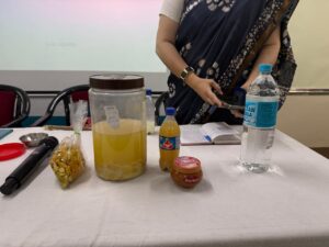 Traditional and sustainable alternatives such as Dant Manjan, Shikakai, and Ritha (Soapnut) were introduced as eco-friendly replacements for chemical products. A live demonstration on the preparation of Bio-Enzymes from kitchen waste and simple eco-friendly pesticides was conducted, providing practical exposure to natural cleaning and home-care solutions.