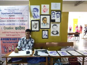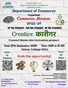 The Department of Commerce, Kaveri College of Arts, Science and Commerce, proudly celebrated its annual event Commerce Horizon 2025–26, a vibrant platform that brought together innovation, talent, and entrepreneurial flair under one roof. A major highlight of this year’s celebration was Creative कारिगर, an eco-conscious initiative that invited students to transform waste materials into artistic and useful creations. The event aimed to promote the values of sustainability, creativity, and resourcefulness, aligning perfectly with the college’s vision of holistic education. Students enthusiastically participated and showcased an impressive range of handmade products — from decorative items and paintings to innovative recycled crafts. Each exhibit reflected the students’ commitment to environmental awareness and their ability to combine creativity with practical thinking.