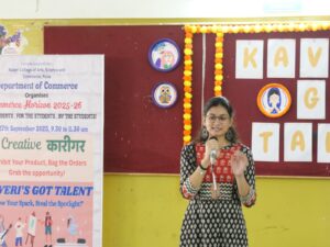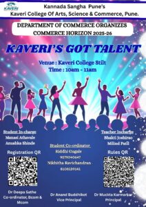 The Department of Commerce, Kaveri College of Arts, Science and Commerce, Pune, organized Kaveri’s Got Talent under Commerce Horizon 2025–26 on 27th September 2025. The event provided a lively platform for students to showcase their creative skills in dance, music, poetry, and instrumental performances. A total of 14 enthusiastic participants took part, adding vibrancy and variety to the competition. The event was judged by Mrs. Swetlana Kulkarni, who appreciated the diverse talents and confident presentations of the students.