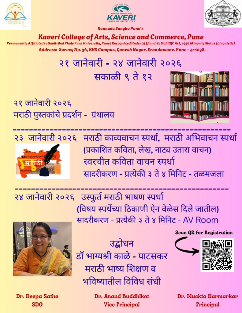 मराठी भाषेचे वैभव जपण्यासाठी तिचे संवर्धन व सार्वत्रिक वापर होण्यासाठी प्रतिवर्षी दिनांक १४ जानेवारी ते २८ जानेवारी हा कालावधी मराठी भाषा पंधरवाडा म्हणून साजरा करण्याचा निर्णय महाराष्ट्र शासनाने घेतला आहे त्यानुसार यावर्षी देखील मराठी भाषे संदर्भातील विविध कार्यक्रम मराठी भाषा संवर्धन पंधरवड्यामध्ये कावेरी