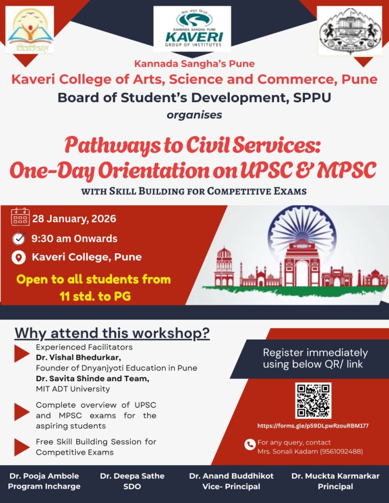 Kaveri College of Arts, Science and Commerce, Pune, is organizing a One-Day Workshop on UPSC and MPSC titled “Pathways to Civil Services” on 28 January 2026, from 9.30 a.m. to 4.00 p.m., at the college campus.