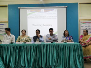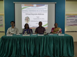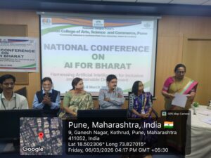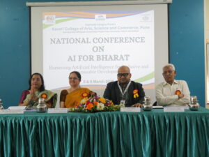Kaveri College of Arts, Science and Commerce organized a Two Days National Level Conference on “AI for Bharat” Harnessing Artificial Intelligence for inclusive and Sustainable Development” to explore the role of Artificial Intelligence in education, industry, and societal development. The conference was inaugurated in the presence of distinguished dignitaries Dr.Narayan Hegde, Vice President of Kannada Sangha Pune, Mrs. Radhika Sharma, Joint Treasurer of Kannada Sangha Pune, Dr. Mukta Karmarkar, Principal of the college, Dr. Anand Buddhikot, Vice Principal, Mrs. Chitra Alavani, IQAC Head and Co-Convenor, and Mrs. Pallavi Joshi, M.Sc. CS Coordinator and Co-Convenor.