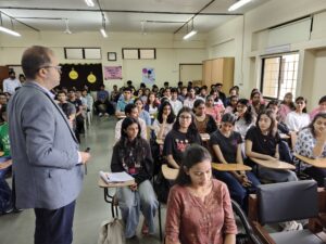 The guest speaker, CA Kedar Raje, Senior Partner and Audit Leader at Deloitte Haskins and Sells LLP, shared his rich professional experiences and guided students on the dynamic journey of becoming a Chartered Accountant. Through a detailed presentation, he highlighted the scope of the CA profession along with the expectations of industry, auditors, and clients.