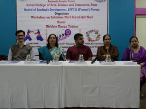 Women’s Forum of Kaveri College of Arts, Science and Commerce, Pune in association with Board of Student’s Development SPPU organised a workshop on Saksham Nari Surakshit Nari under Nirbhay Kanya Yojana. The workshop was based on the holistic empowerment of girl students, focusing on their physical health, mental strength, personality development, and personal safety. The workshop had 3 resource persons with a strong background in their respective fields.The workshop began with Deep Prajwalan, Vidyapeeth Geet and the welcome address given by Dr. Muckta Karmarkar, Principal Kaveri College. An insightful introduction of the workshop was given by Dr. Deepa Sathe, Student Development Officer. The first resource person Mr. Mohak Barve was felicitated by Dr. Muckta Karmarkar Principal and the second Mrs. Dhanashree Ghate was felicitated by Mrs. Bhakti Joshirao Chairperson of Women’s Forum Committee and the third Mr.Anup Dattatray Doiphode was felicitated by Dr.Deepa Sathe Student Development Officer.